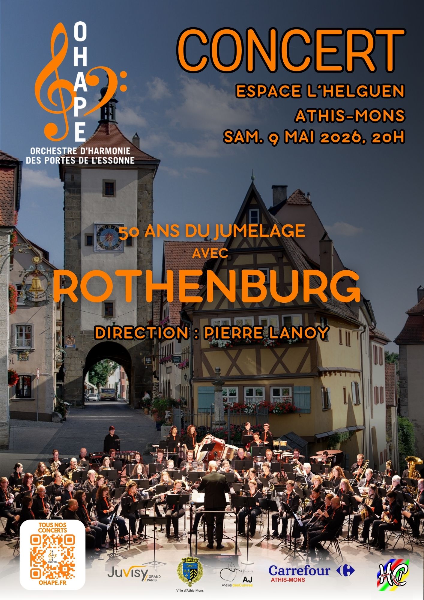 Date : Samedi 09 mai 2026 Heure : 20h Lieu : Espace René L’Helguen, ATHIS-MONS Thématique : 50 ans du jumelage avec Rothenburg (Allemagne) Programme : A date anniversaire, concert en présence de la délégation…